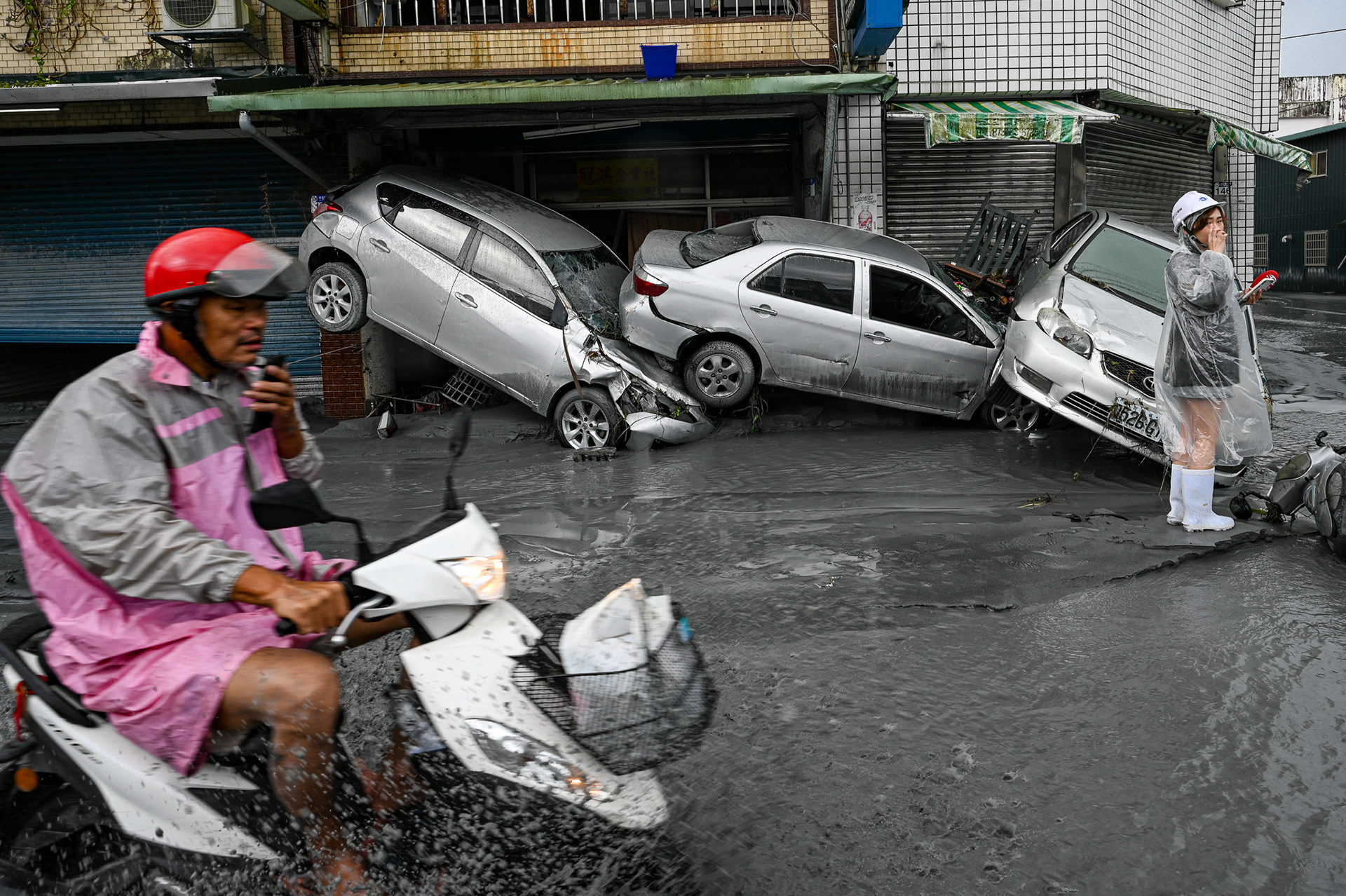 A resident walks along a street covered with mud, following the bursting of a barrier lake. The bursting of the barrier lake in Taiwan killed at least 14 people, after Super Typhoon Ragasa pounded the island with torrential rains.
